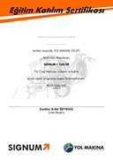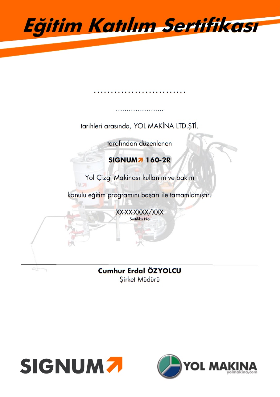 SIGNUM Yol Çizgi Makinalarının tesliminde kullanıcı personele uygun süre ile kullanıcı eğitimleri verilmektedir. Bu eğitimler makinanın kullanıcılara tanıtılmasını, doğru kullanım şeklinin gösterilmesini, arıza izleme, bulma ve giderme yollarının ve rutin bakımlarının nasıl yapılacağının öğretilmesini kapsar. Eğitim verilen personele eğitim sonrasında Eğitime Katılım Sertifikası verilmektedir.