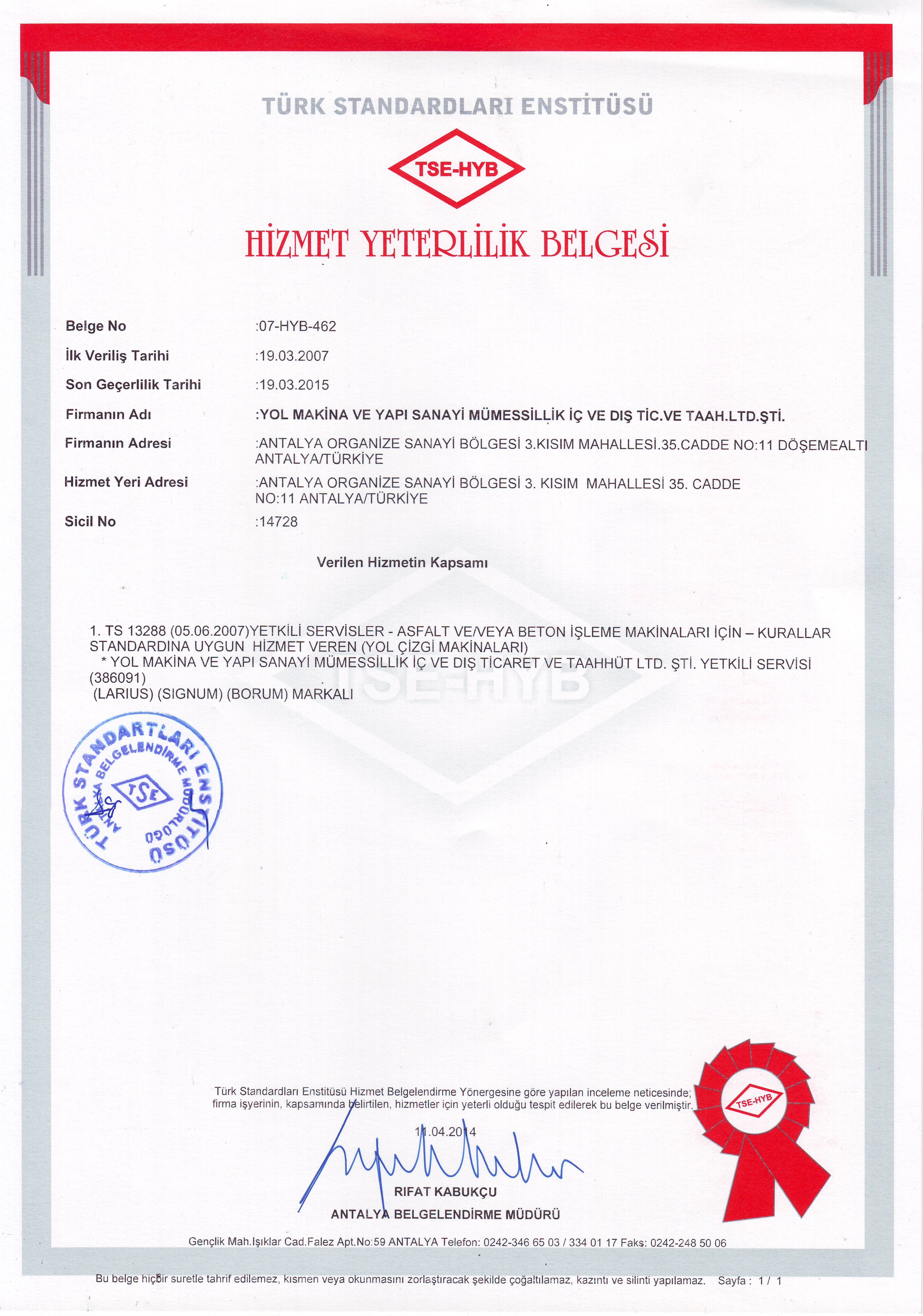 SIGNUM Yol Çizgi Makinalarının servis ve bakımları tam teçhizatlı servis aracımız ve uzman personelimiz ile ihtiyaca göre yerinde veya Antalya Merkez Servisimizde gerçekleştirilmektedir. Tüm Satış Sonrası Hizmetlerimiz Türk Standartları Enstitüsünün 19.03.2007 tarih ve 07-HYB-462 sayılı Hizmet Yeterlilik Belgesi kapsamında yürütülmektedir.